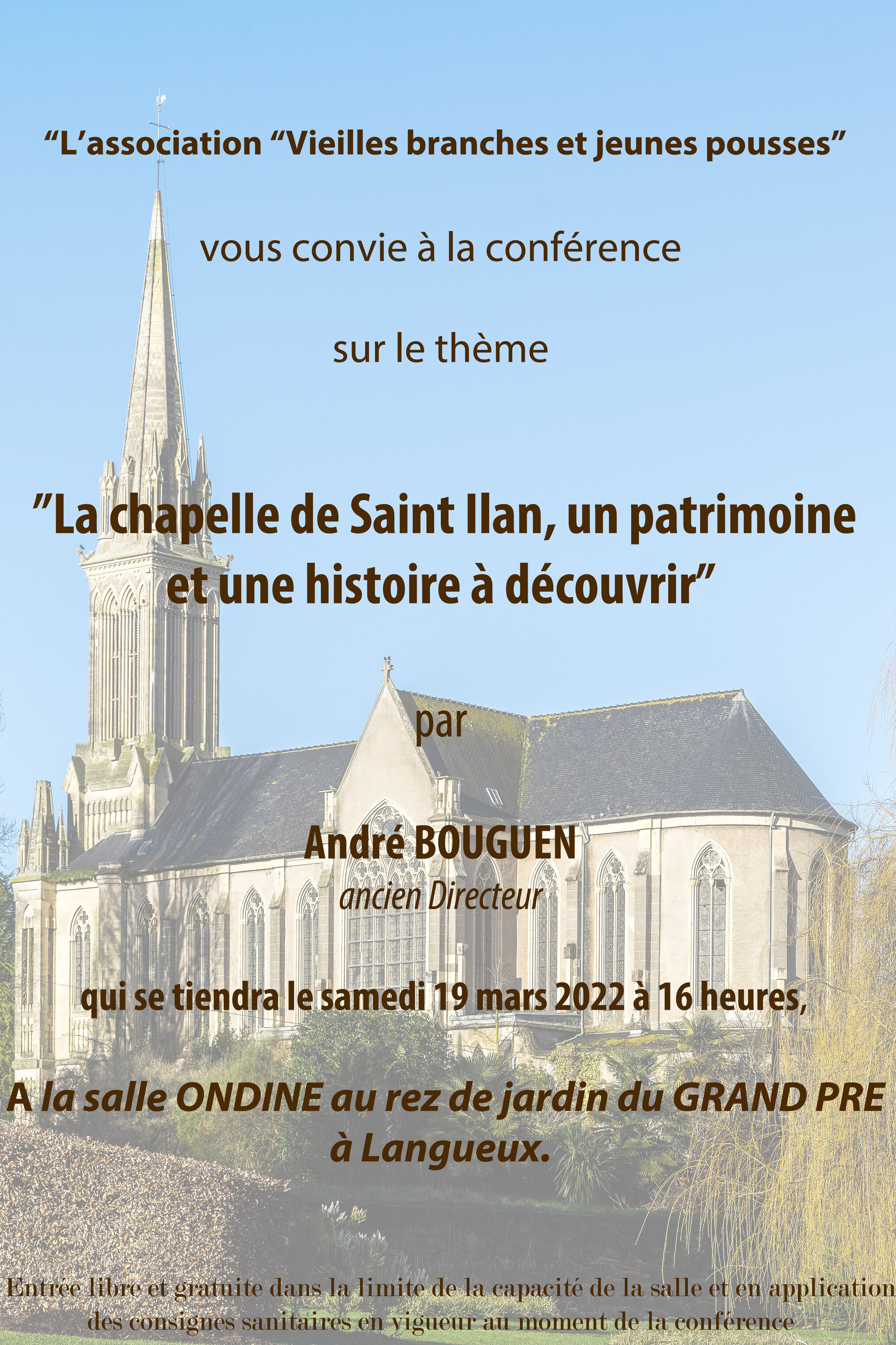 L'association " Vielles branches et jeunes pousses" vous convie à la conférence sur le thème "Chapelle de Saint Ilan, un patrimoine et une histoire à découvrir" par André Bouguen qui se tiendra le samedi 19 mars à 16h à la salle ONDINE à Langueux.