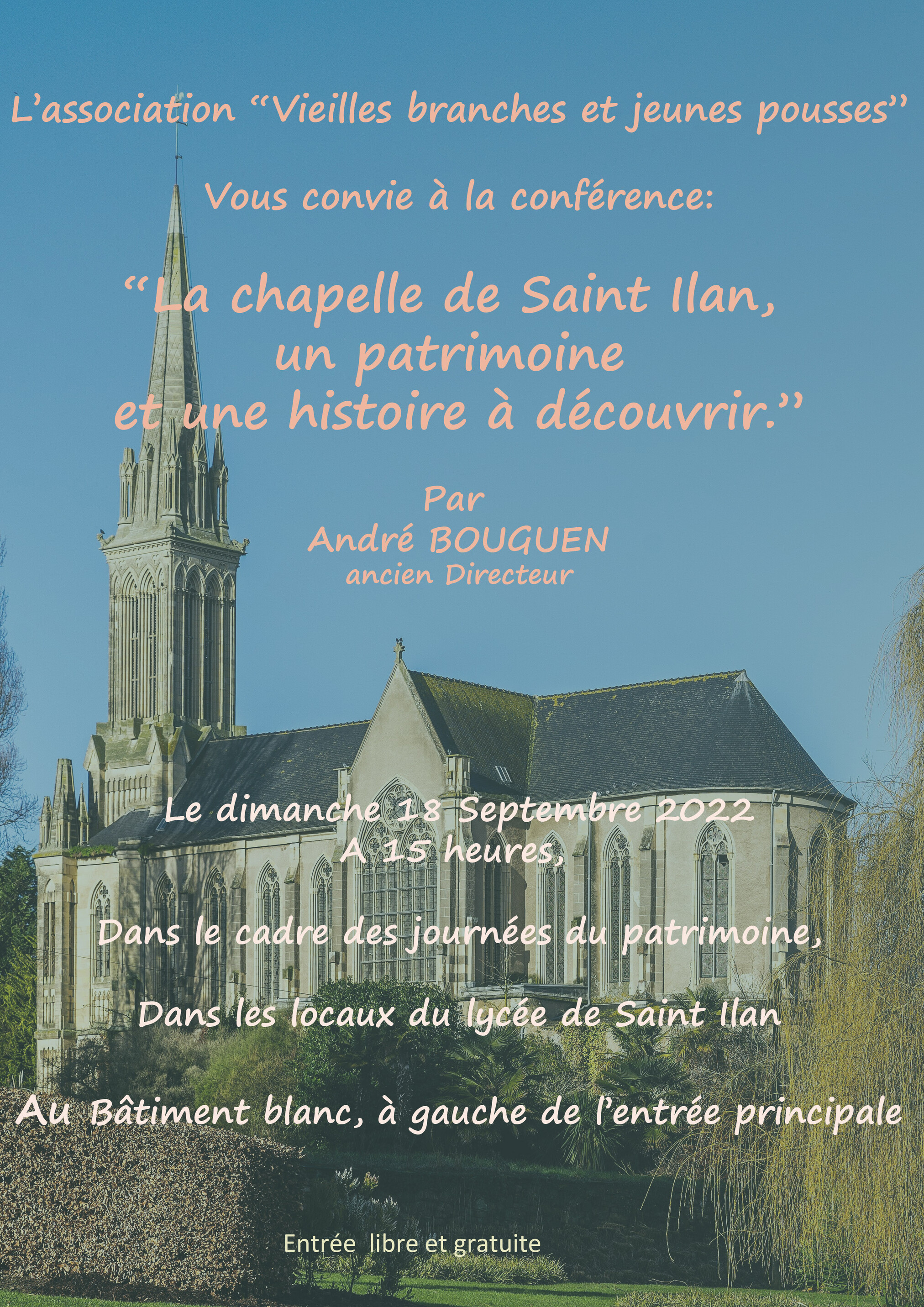 Dimanche 18 septembre à 15h - Dans le cadre des journées du patrimoine, venez nombreux à la conférence sur "La chapelle de Saint Ilan, un patrimoine et une histoire à découvrir" animée par André Bouguen, ancien Directeur de l'école.