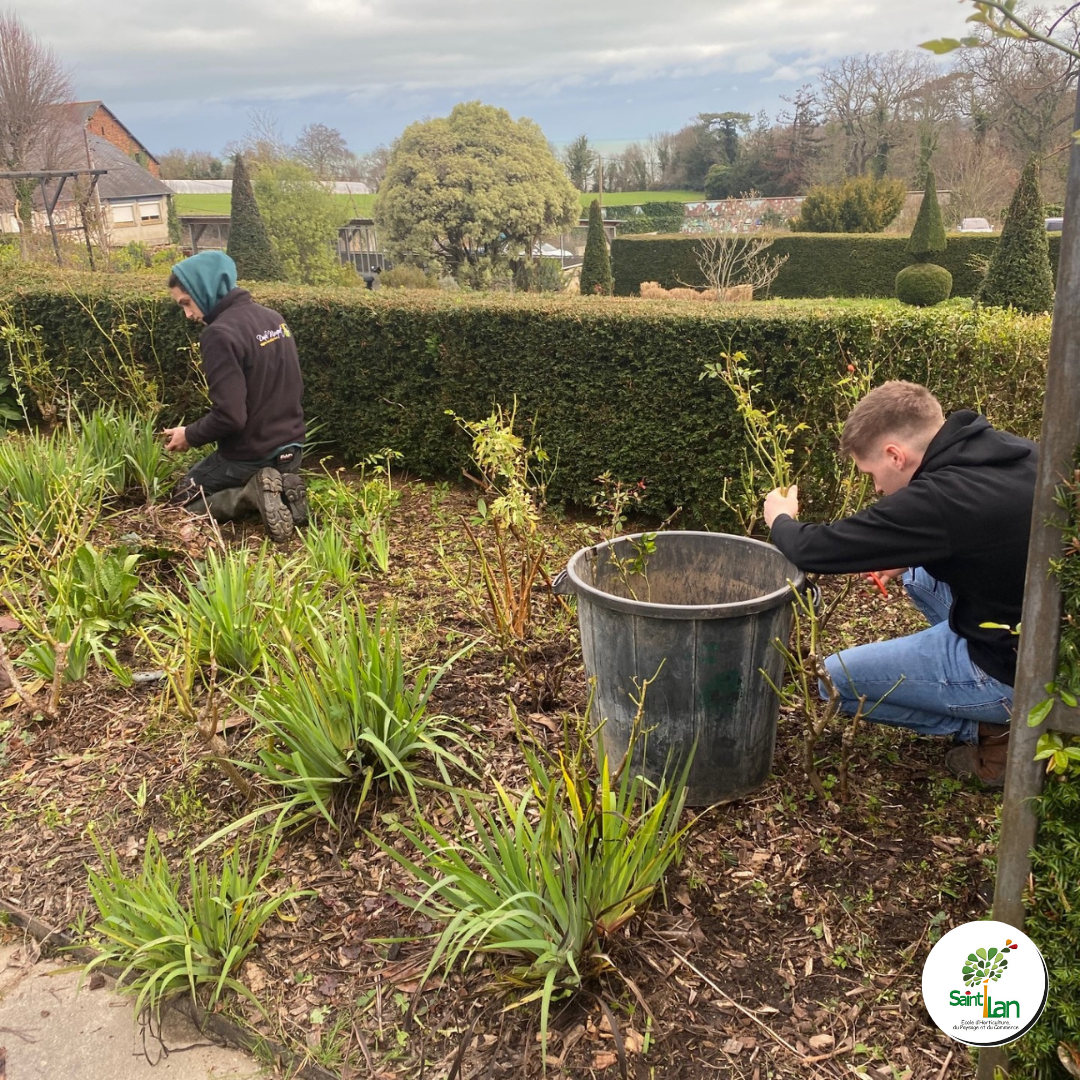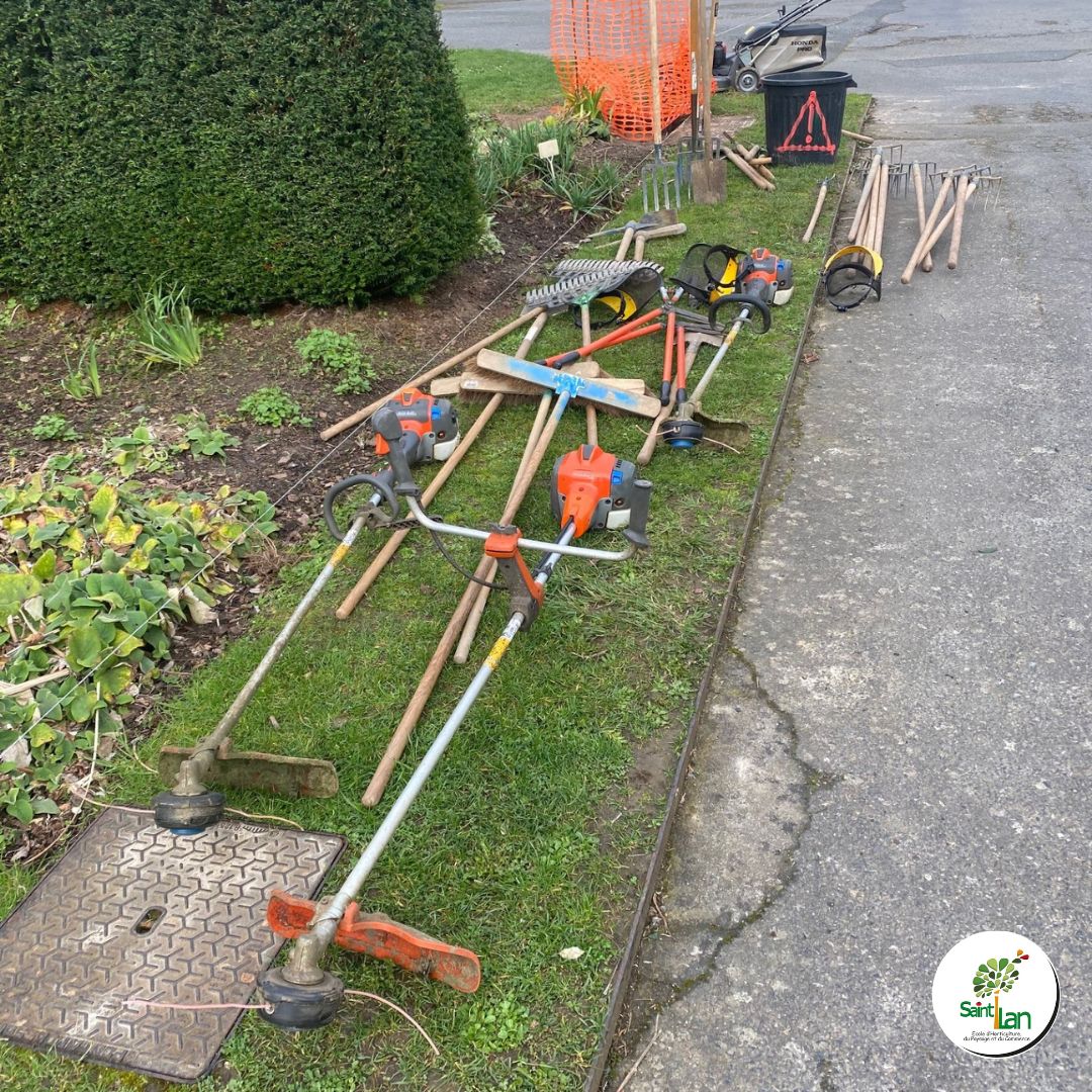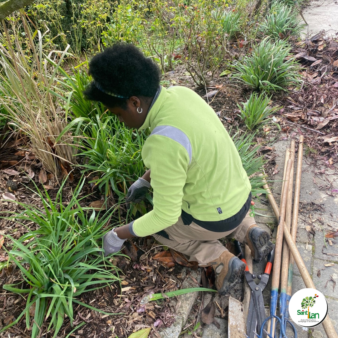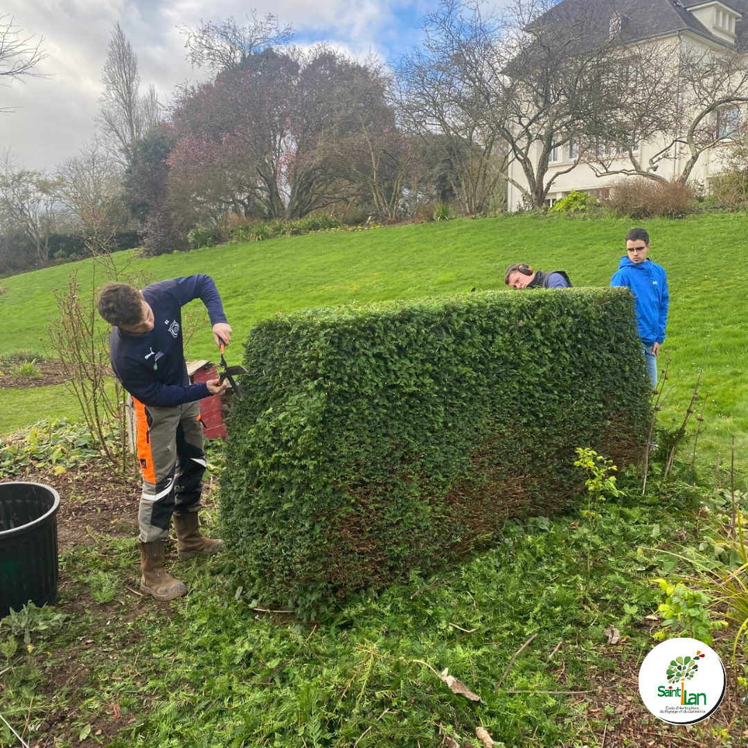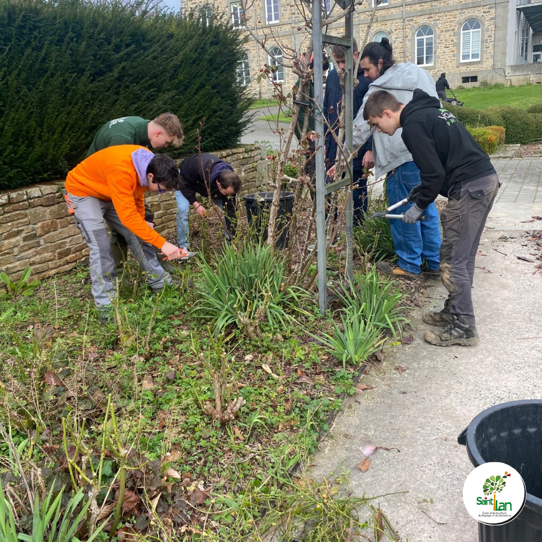 Les apprentis en BTS 2 Aménagements Paysagers entretiennent les espaces verts à l'entrée de l'établissement.