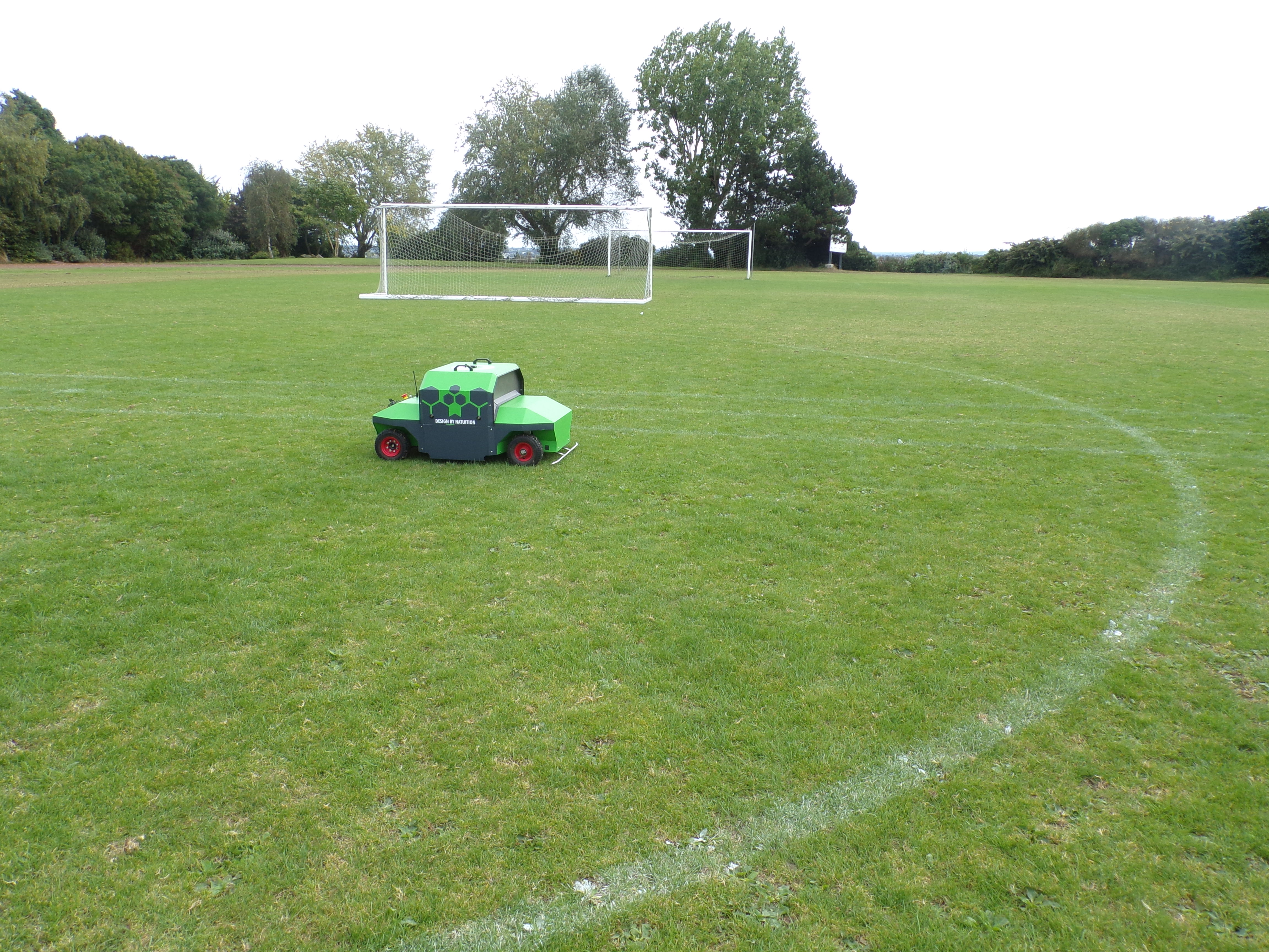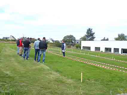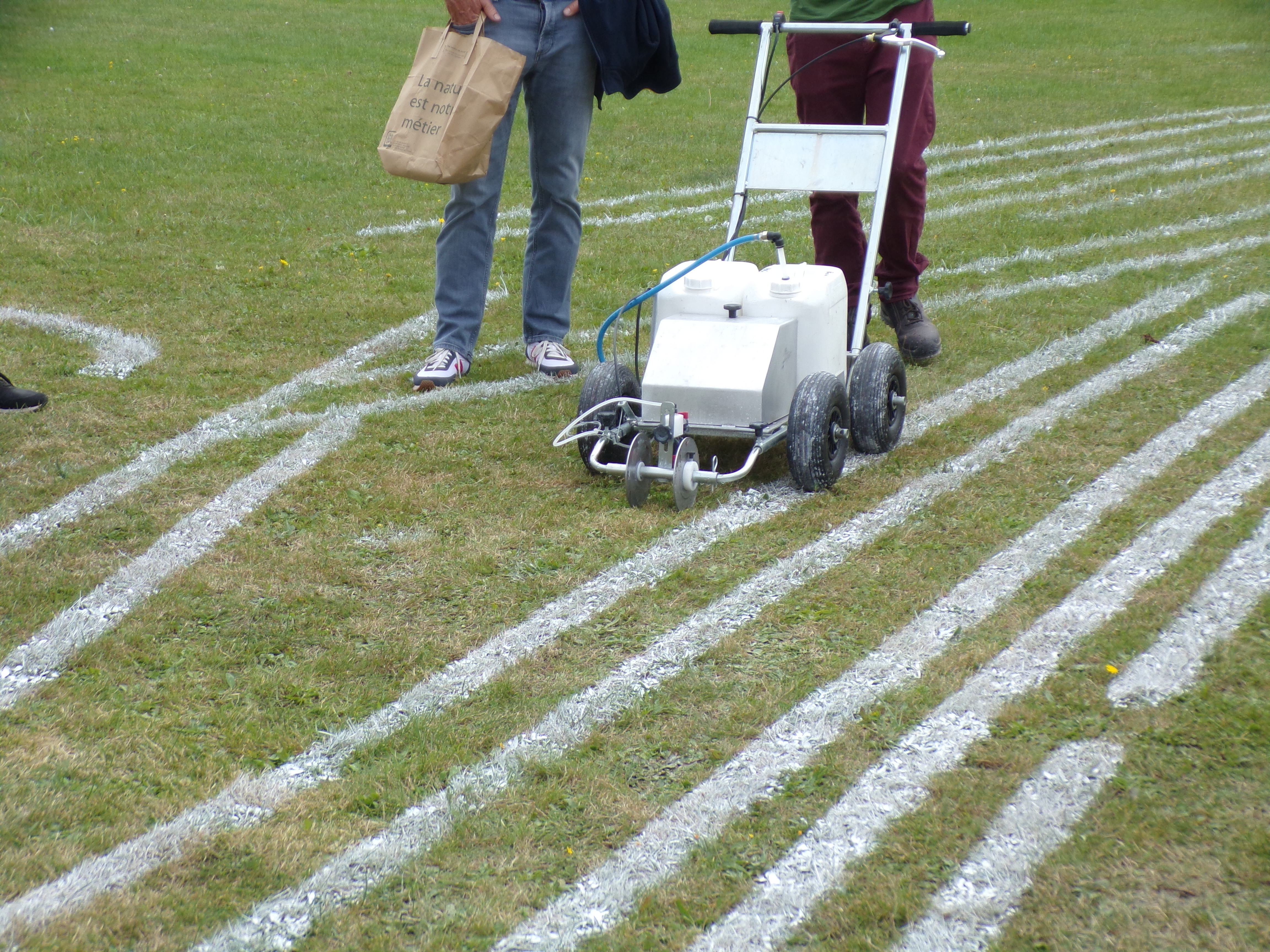 Au terrain de foot, 3 démos différentes sont présentées : le robot de désherbage à guidage satellite, un professionnel traceur démontre le traçage de lignes de peinture ainsi que la démonstration de herse étrille pour le nettoyage du gazon.